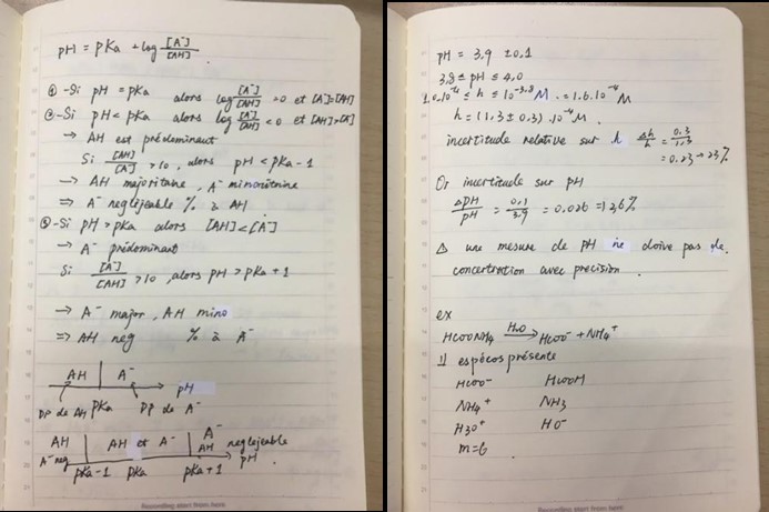 全班约40人,课程持续两小时,前40分钟进行了作业答疑,在学生的争相提问和老师迅速而精妙解答中可见法国预科学校课堂的开放活跃和高水平教育,全部问题答疑完毕后作业便不需再过多讲解,提高了作业讲评效率。随后正式开始讲课,本次课程内容为给定浓度溶液的PH计算。老师首先用手写投影的方式介绍了PH计算的基本原理和定性判断方法,然后发放讲义用思维导图的形式高度概括了所授内容,最后结合具体例题帮助学生消化理解。